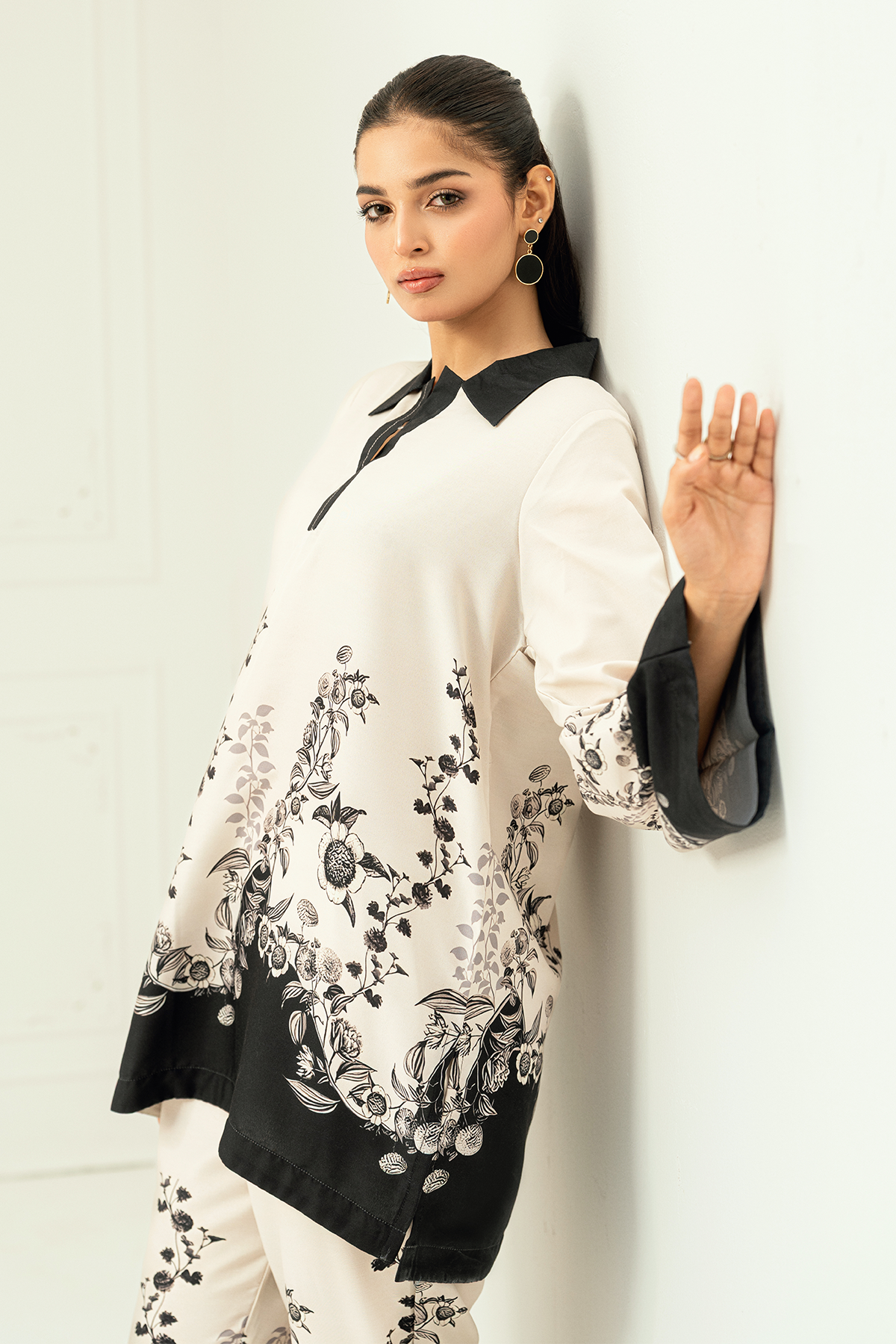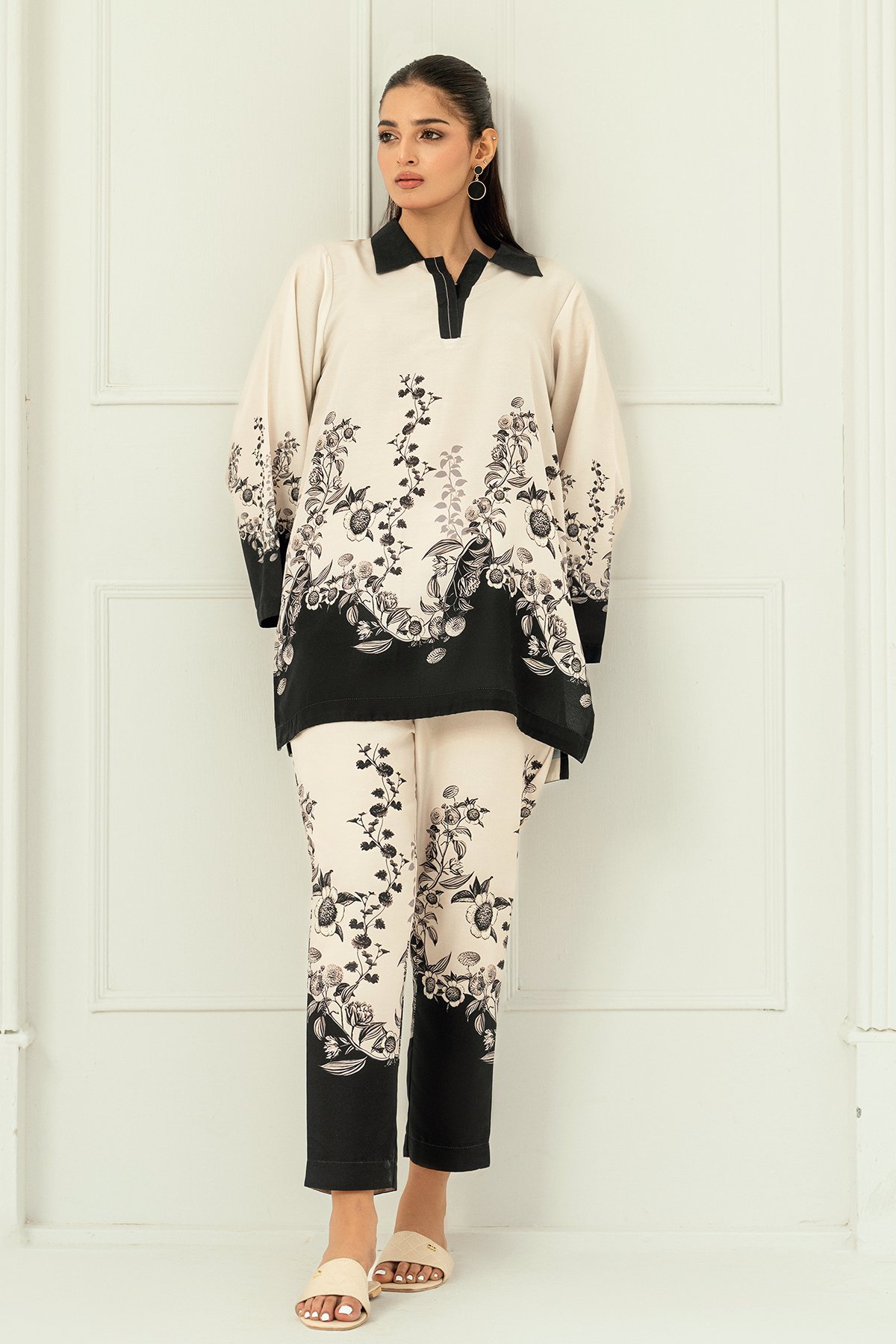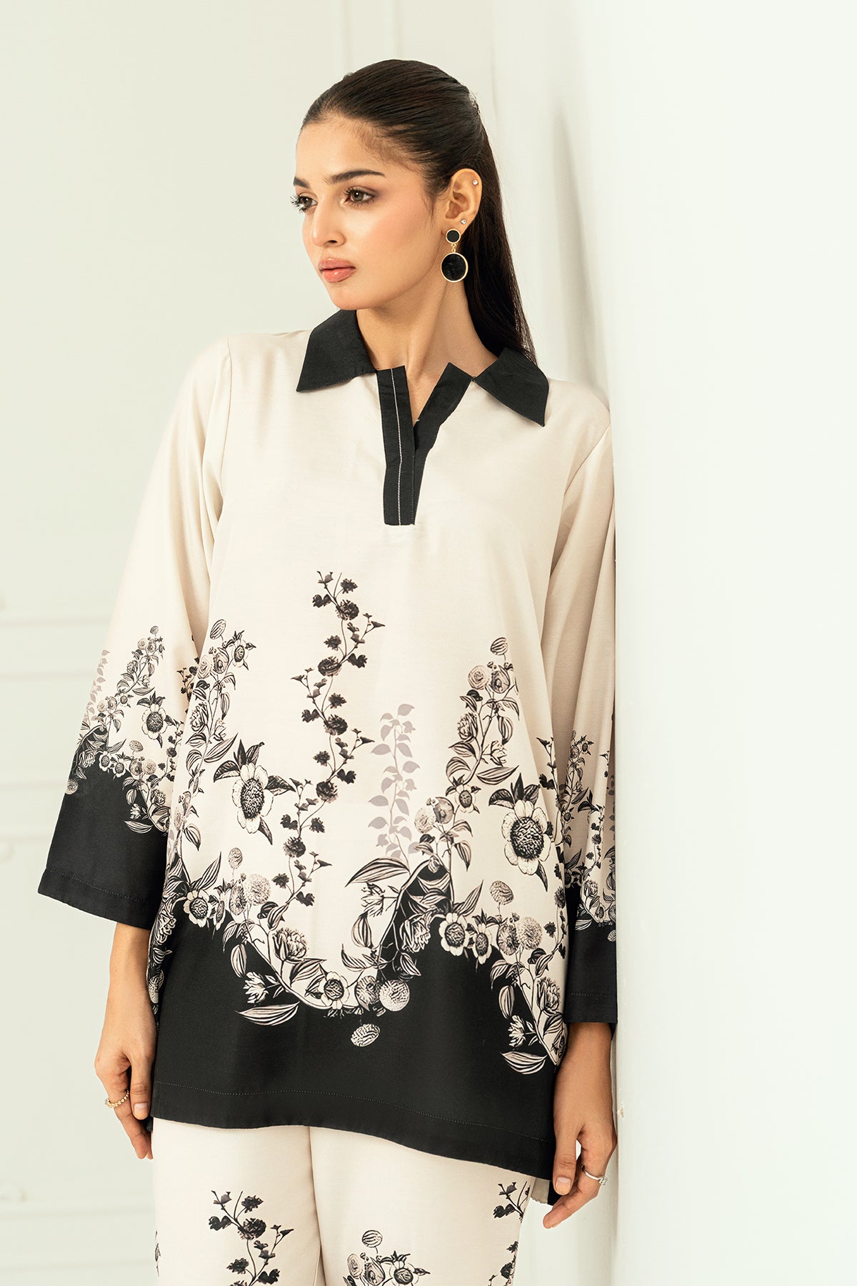 Alaya, crafted in premium Arabic lawn for unmatched softness and breathability. The elegant ivory and black floral print, paired with a contrasting collar and borders, creates a refined look.