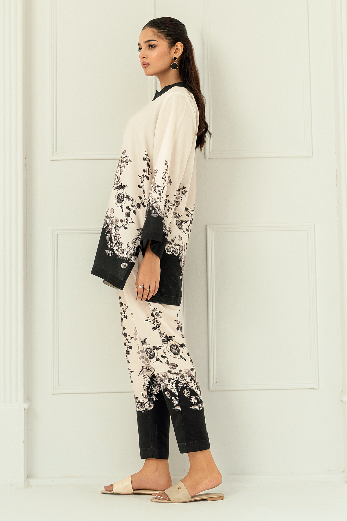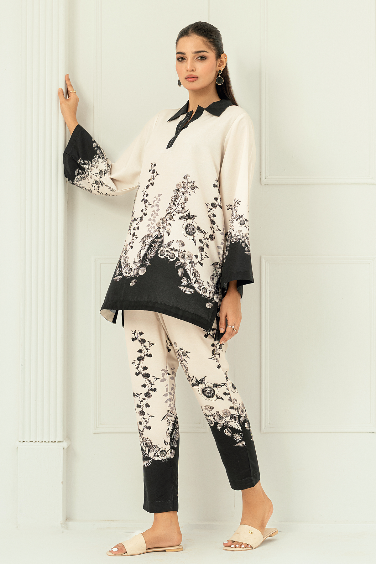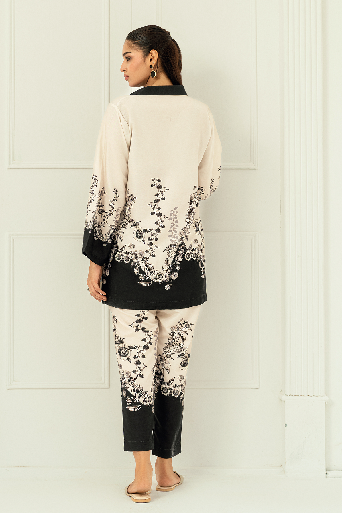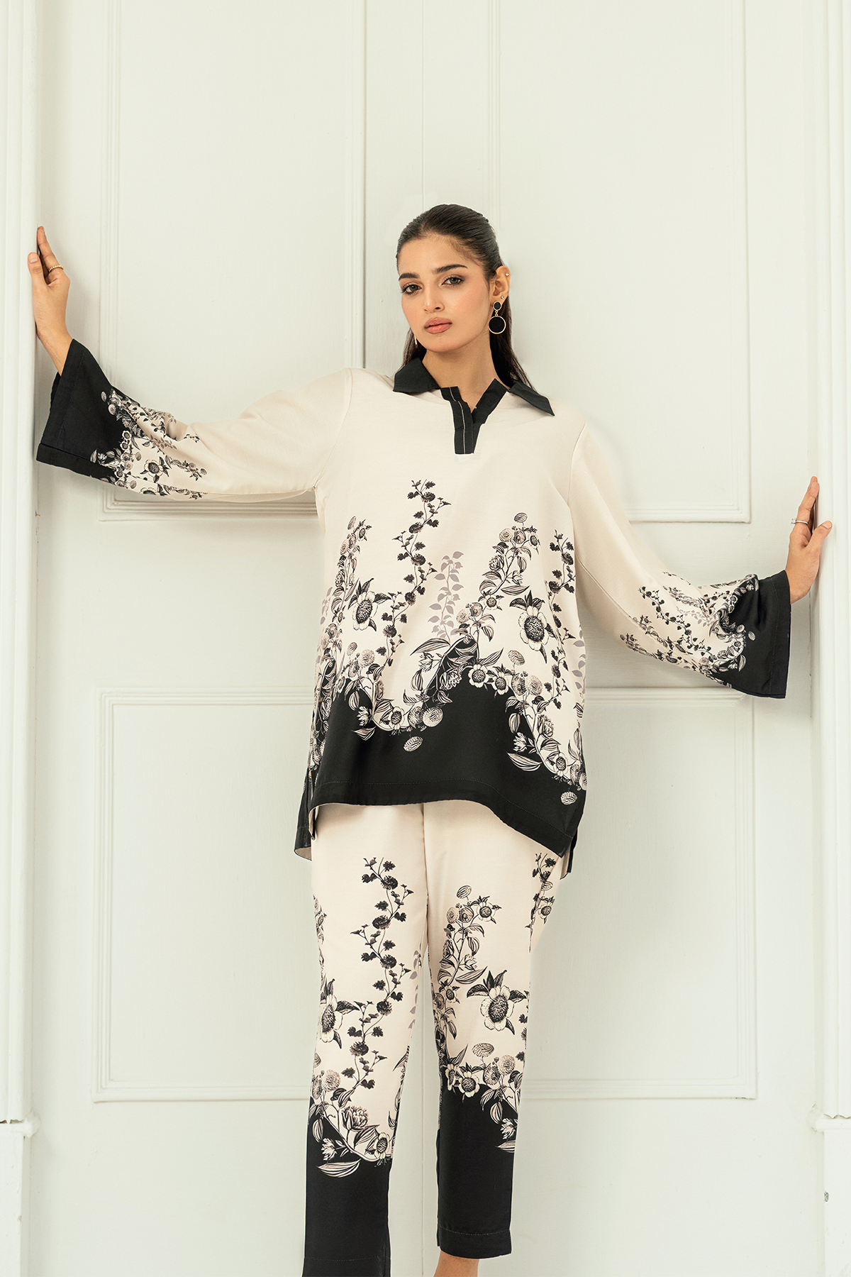 Alaya, crafted in premium Arabic lawn for unmatched softness and breathability. The elegant ivory and black floral print, paired with a contrasting collar and borders, creates a refined look.