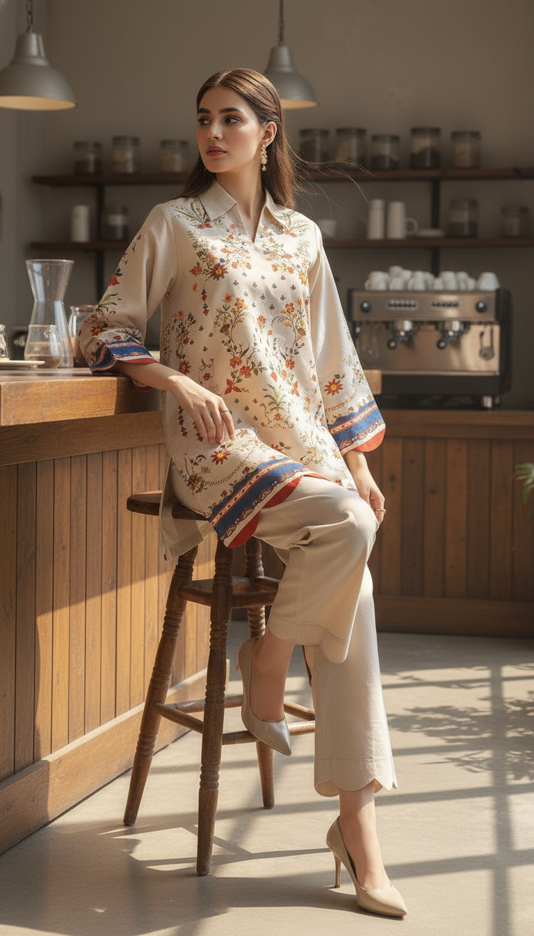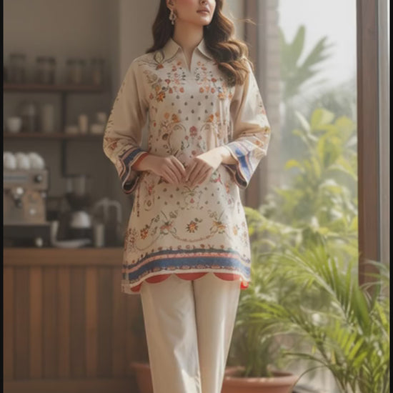 Step into timeless elegance with this beige floral printed two-piece set, designed to bring effortless charm to your everyday look. The straight-cut shirt features a collared neckline and full sleeves, accentuated with delicate multicolored floral motifs and intricate border and scallop edges detailing on the hem and cuffs. The matching wide-leg trousers with a scallop edges add a graceful flow, making this ensemble both comfortable and stylish.